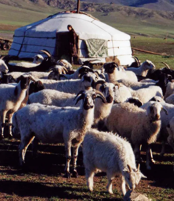 These goats thrive in cold winters, either at high altitudes or in the cold desert plains. This is because they have evolved to grow a secondary undercoat beneath their outer rough coat in Winter, this protects them against the extreme cold. It is this undercoat that is naturally shed every Spring and can be harvested by combing. Mongolian cashmere goats produce around 200g per year but after scouring, dehairing, carding and spinning this can be reduced by half.